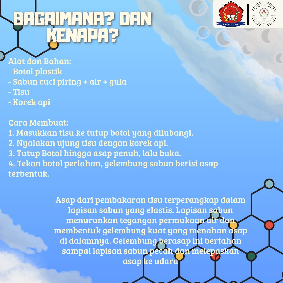 Eksperimen Gelembung Asap ini merupakan kegiatan karya ilmiah remaja yang dilakukan oleh siswa SMK Kesehatan Bojongsoang. Tujuan dari percobaan ini adalah untuk memahami bagaimana asap dapat terperangkap di dalam gelembung sabun dan menampilkan efek visual yang menarik. Dengan menggunakan bahan sederhana seperti botol plastik, sabun cuci piring, air, gula, tisu, dan korek api, percobaan ini menunjukkan interaksi antara udara, asap, dan tegangan permukaan cairan sabun.